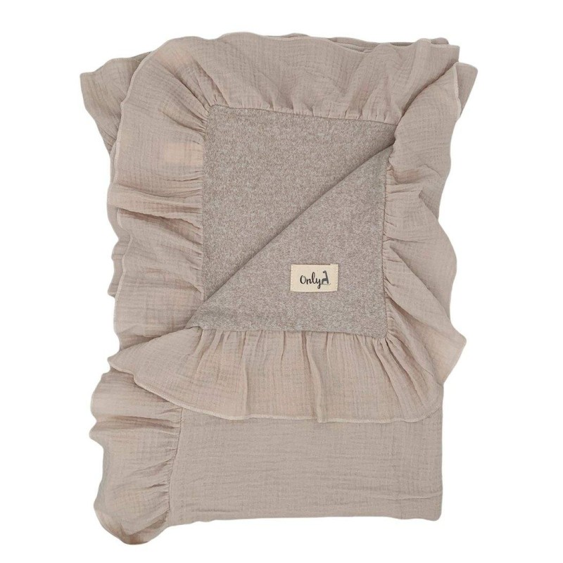 Bonita mantita rematada con un bonito volante reversible: por una cara está confeccionada en suave punto beig y por la otra cara, en bambula transpirable también en color beig.